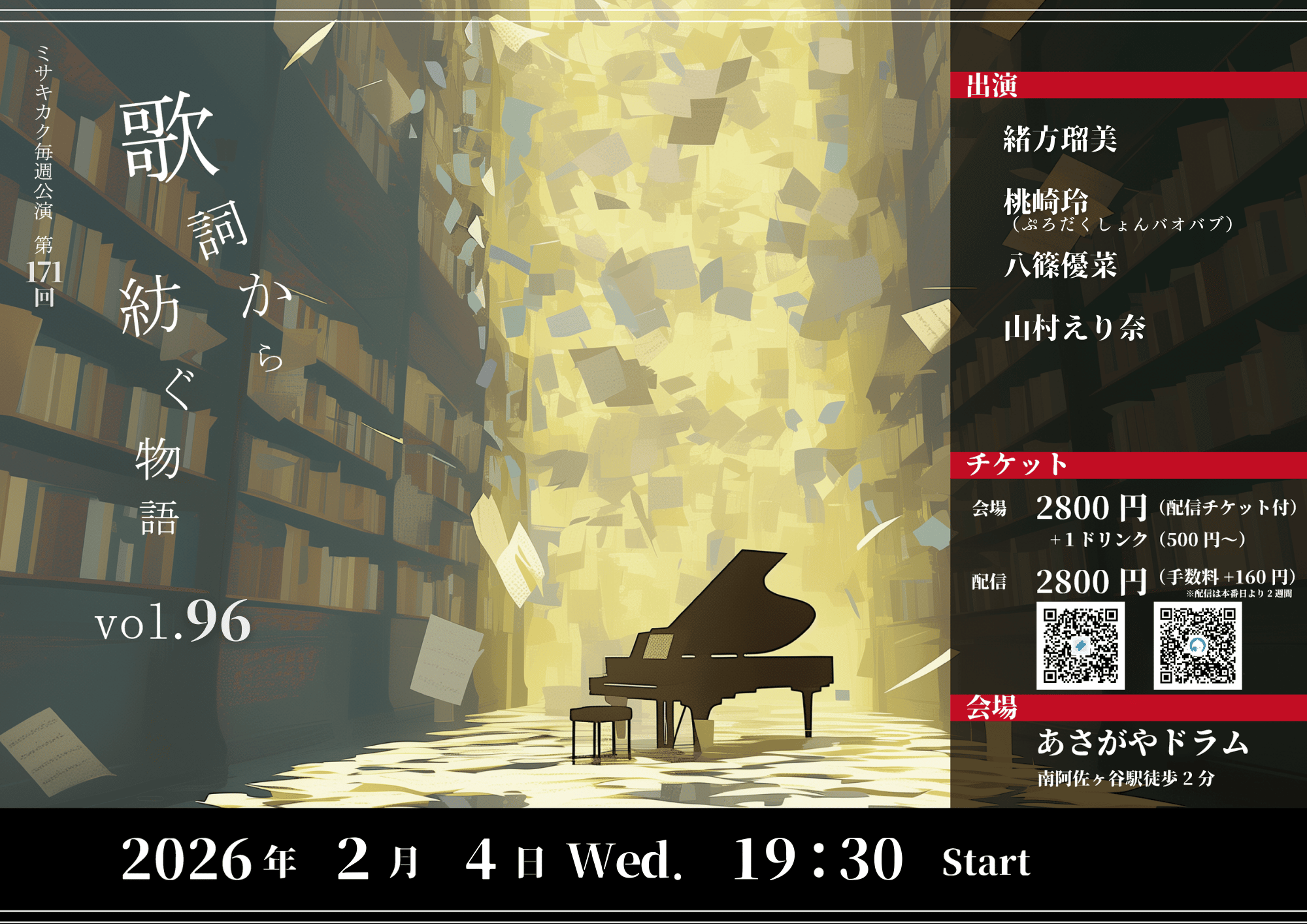 基本的に予告した内容で上演できるよう努めていますが、このご時世のため、出演者の変更や上演内容の差し替えがあることがあります。予めご了承ください。