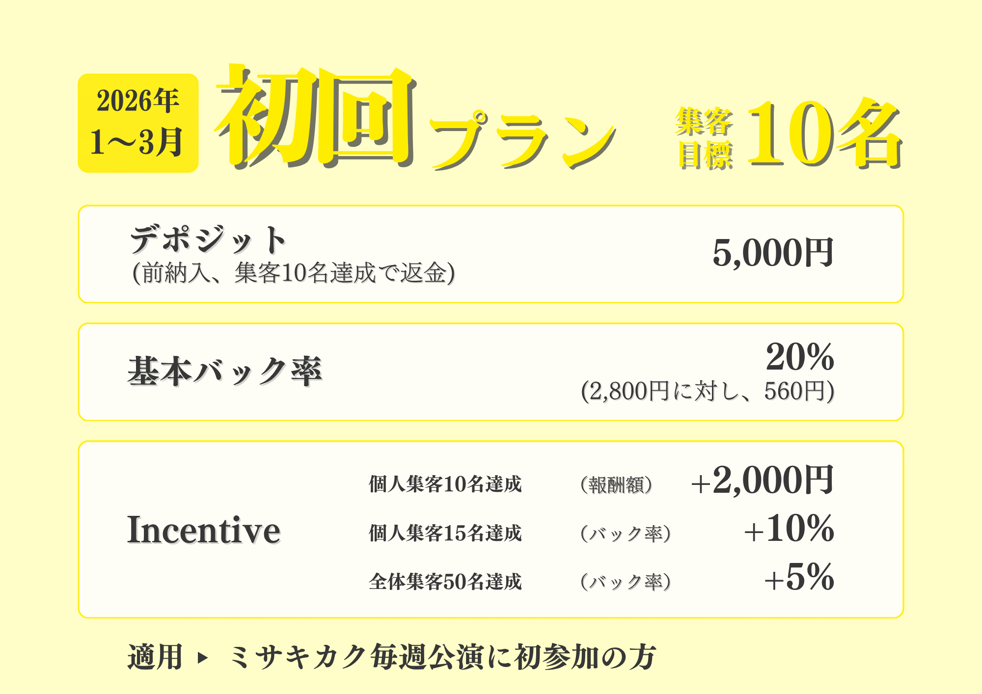 | その他 | 稽古時間内に宣伝タイムを設けます。 みんなで効果的な宣伝方法を考えながら集客に結び付けていきます。 稽古時に宣伝用の集合写真も撮影します。 |