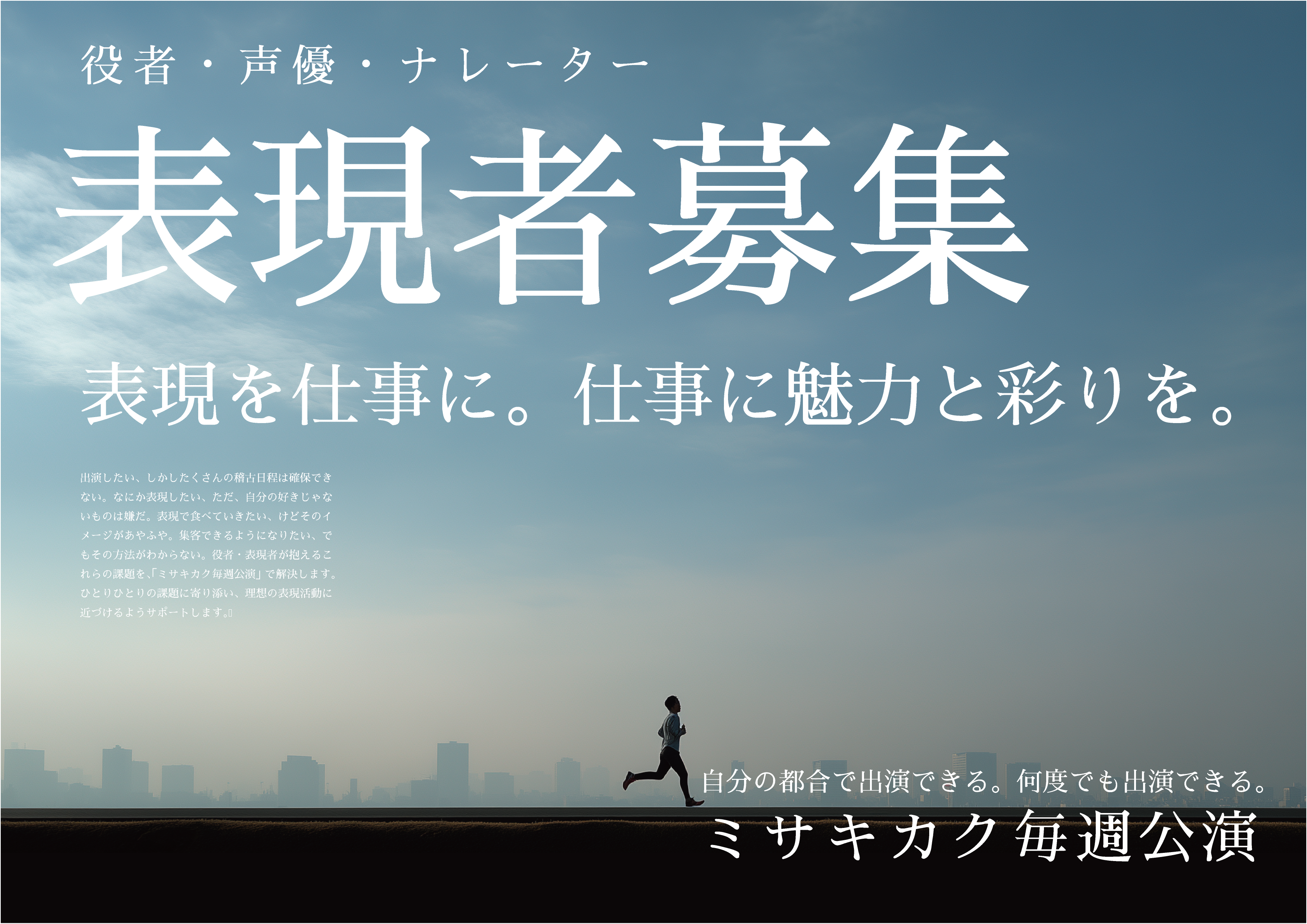 ー1回目の稽古ー どの週に出演の方も、11:00〜14:00での稽古となります。 ー2回目、3回目の稽古ー 出演本番週により時間帯が変わります。 [第1週][第3週]→15:00〜18:00 [第2週][第4週]→19:00〜22:00 ※稽古の進行具合で予定より早く終了することがあります。 ※NGの人数次第では稽古がなくなる場合があります。 ※具体的な稽古日時は、オーディション通過後に改めてご案内します。 |